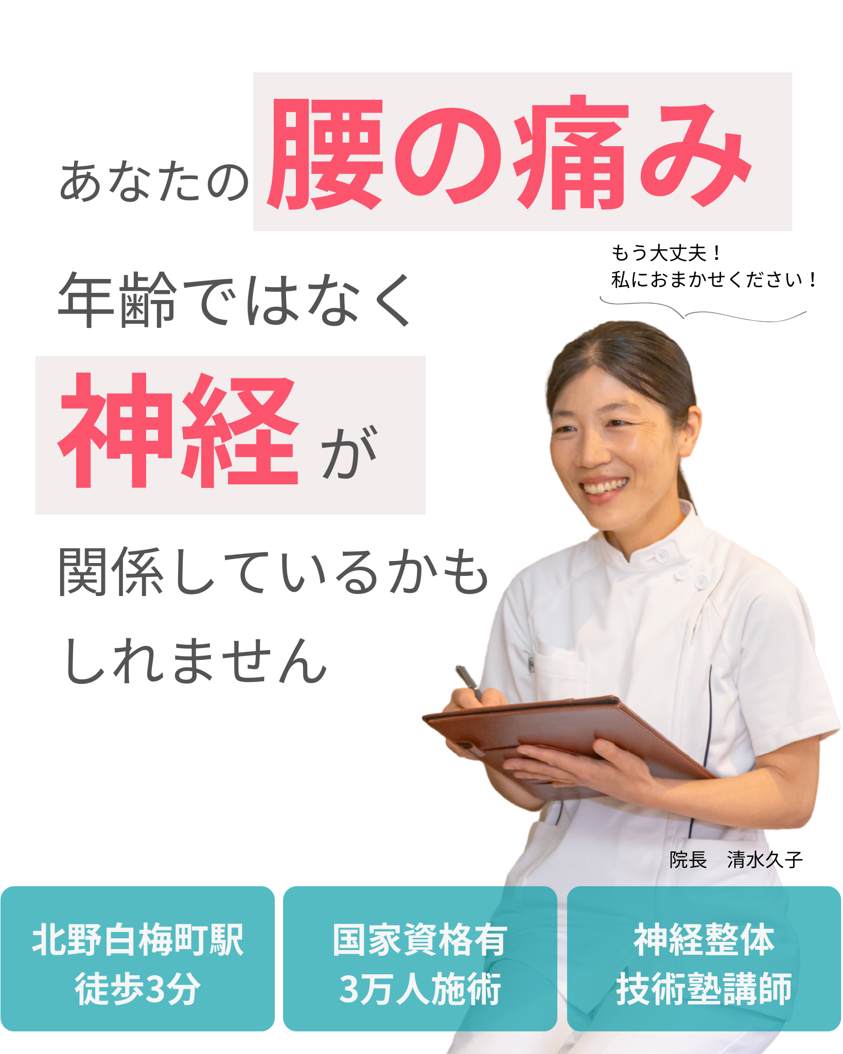 バンバンの整体代表の清水久子(しみずひさこ)と申します。