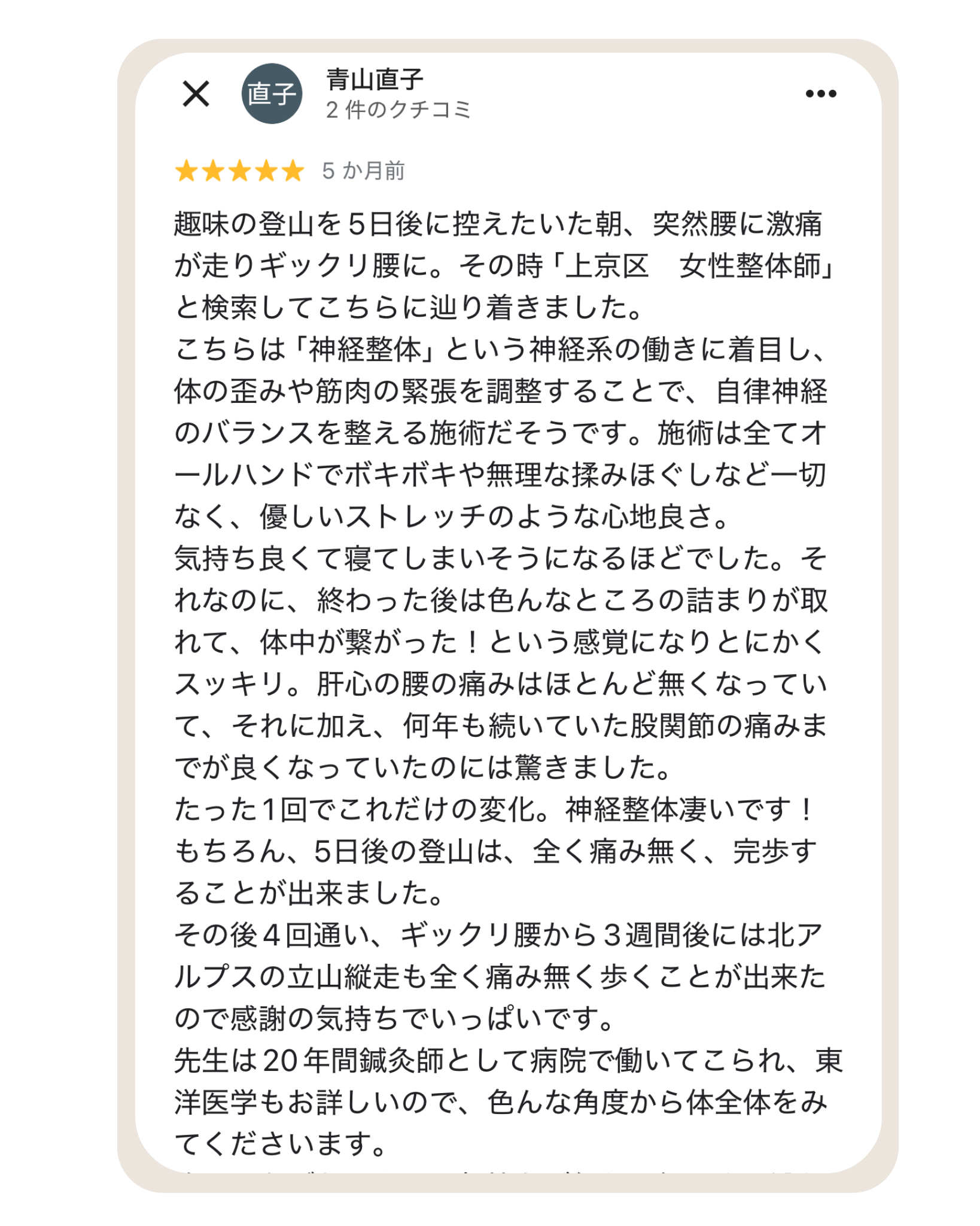 ✔️ 実績がある女性整体師(国家資格取得者)が担当する整体に行きたい